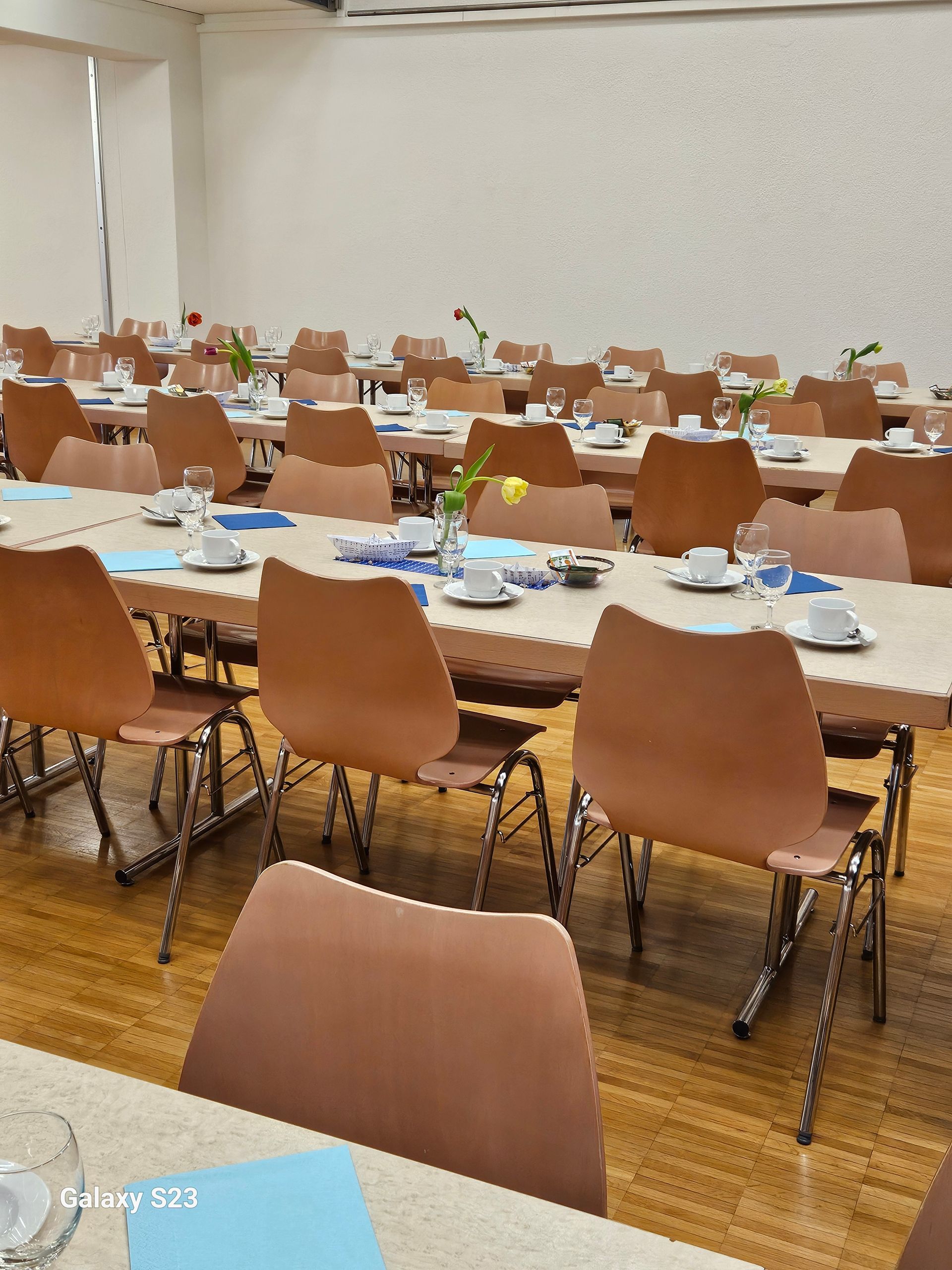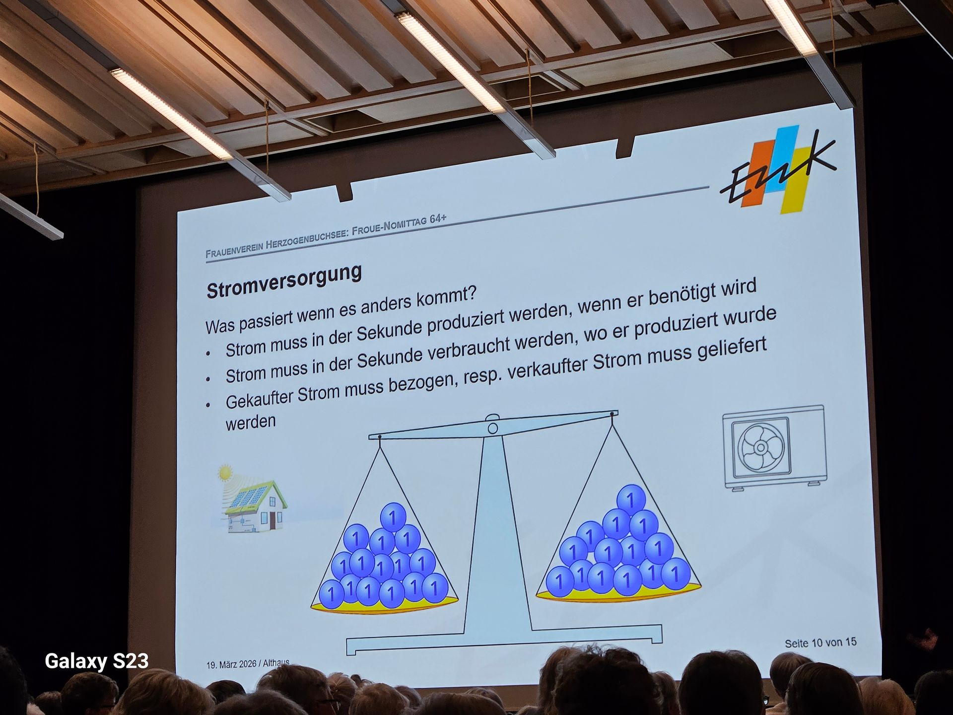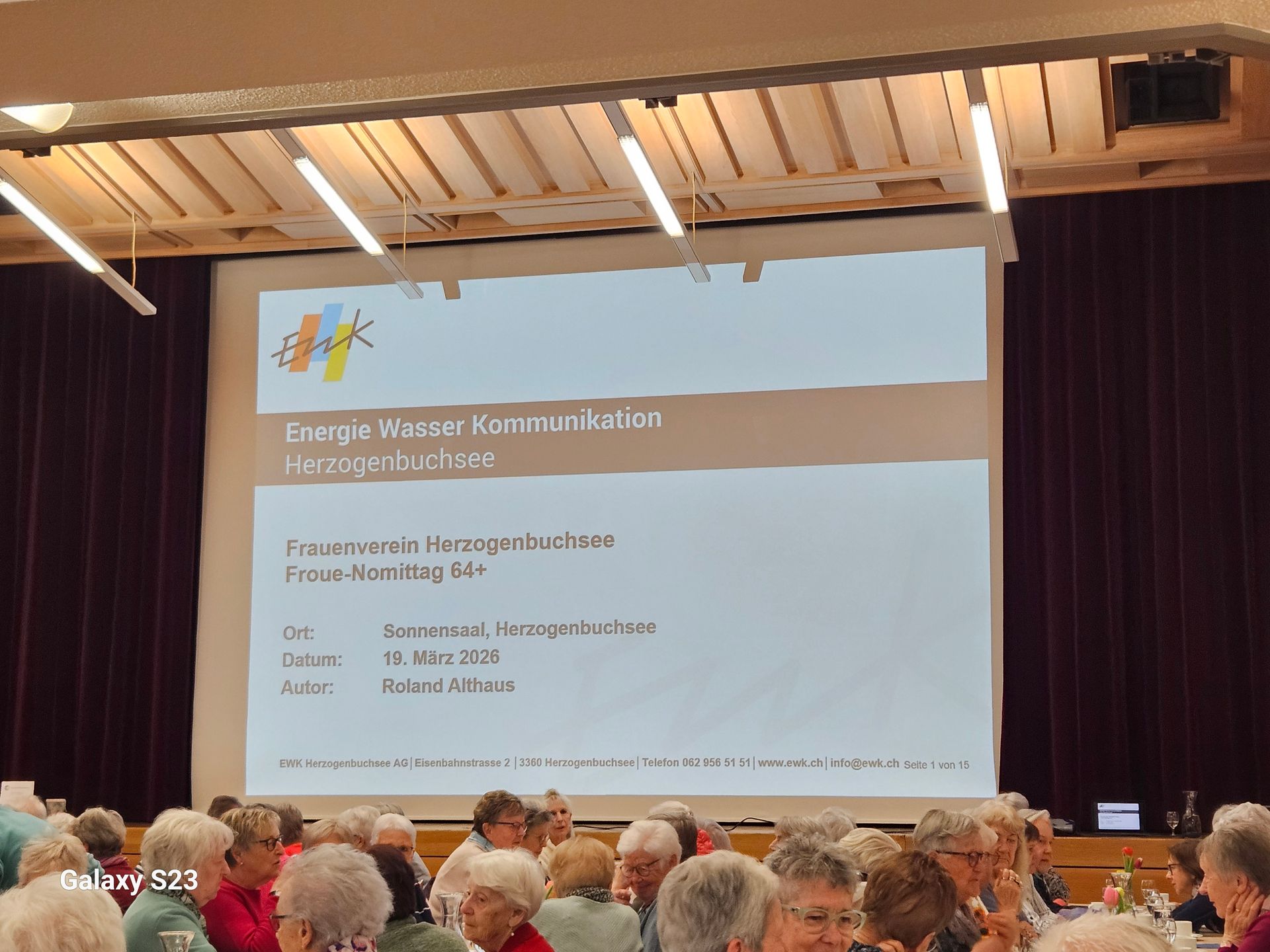 Blauer Himmel, angenehme Frühlingstemperatur, und trotzdem fanden 134 Frauen den Weg in den Sonnensaal. Wir waren sehr überrascht - und haben uns natürlich auch sehr gefreut. Nichts Musikalisches war für diesen Nachmittag am 19. März geplant. Es ging um Wasser, Strom und Kommunikation. Roland Althaus, Geschäftsführer vom EWK Herzogenbuchsee, erklärte uns auf spannende und verständliche Art, was hinter diesen drei Buchstaben steckt. Was z.B. dafür getan wird, dass immer einwandfreies und genügend Wasser aus unseren Leitungen fliesst, wie schwierig es ist, viele Monate im Voraus abzuschätzen, wie viel Strom am Tag X zur Stunde X gebraucht und somit eingekauft werden muss. Wir haben viel Wissenswertes gehört und schätzen umsomehr, dass es nichts Selbstverständliches ist, immer genügend Strom und Wasser zur Verfügung zu haben. Anschliessend haben wir das Zvieri serviert, einen mit viel Liebe von Sandra Steinegger hergestellten Spitzbueb. Zu den Informationen nach dem Zvieri gehörte der Hinweis, dass man sich am nächsten Anlass für die Reise ins Blaue anmelden kann.