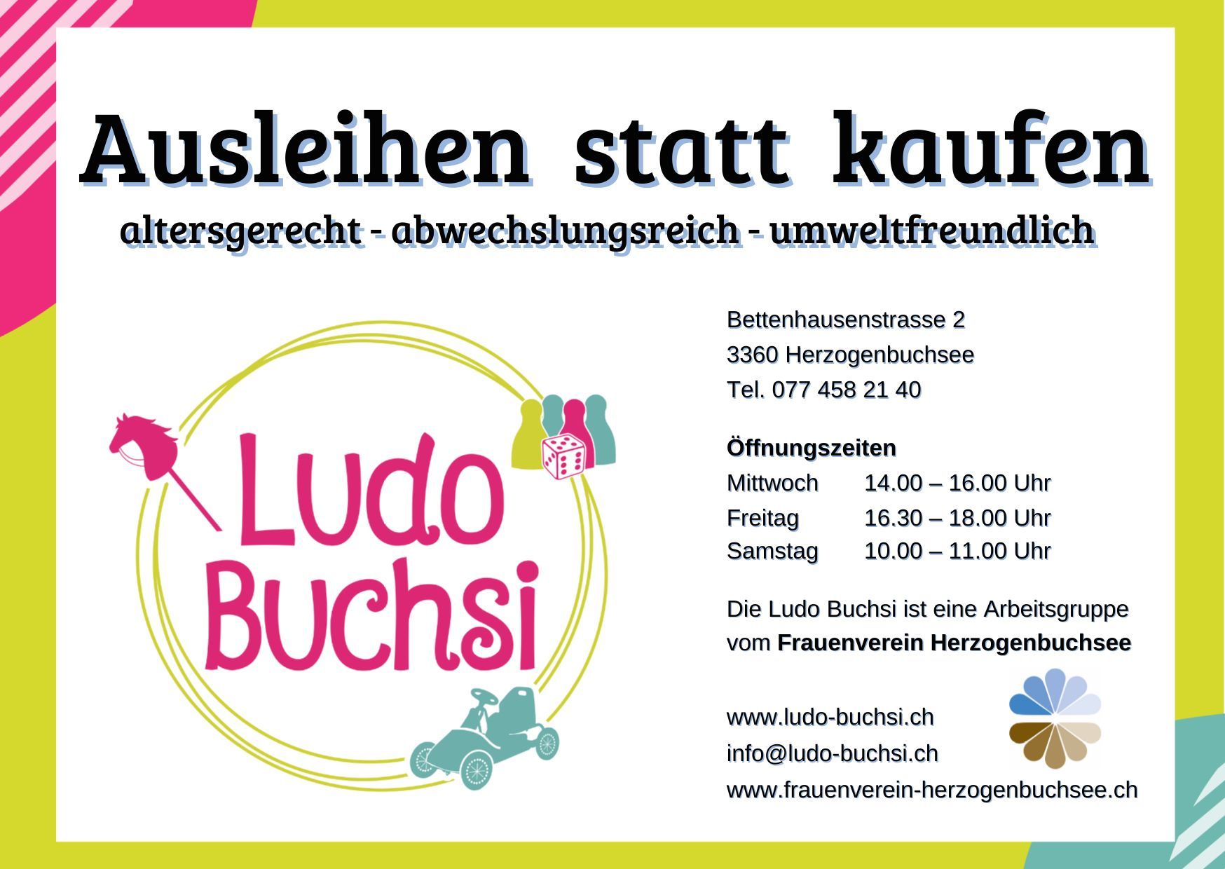 Während den Schulferien ist die Ludothek jeweils am Mittwoch von 14:00 bis 16:00 Uhr geöffnet.